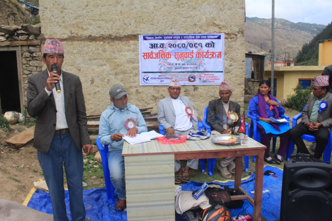 जुम्ला । विकास निर्माणदेखी सेवा प्रभावकारिताका लागि जुम्लाको तिला गााउँपालिका – १ को वडा कार्यालयद्धारा सार्वजनिक सुनुवाई कार्यक्रम आइतबार सम्पन्न गरेको छ । वडा कार्यालयले आर्थिक वर्ष २०८०।८१ को सार्वजनिक सुनुवाई सम्पन्न गरेको हो । सोे वडा स्थानीयबासीले योजना तर्जुमा प्रक्रियामा जनआवाजलाई समावेश गर्न आग्रह समेत गरेकाछन् ।