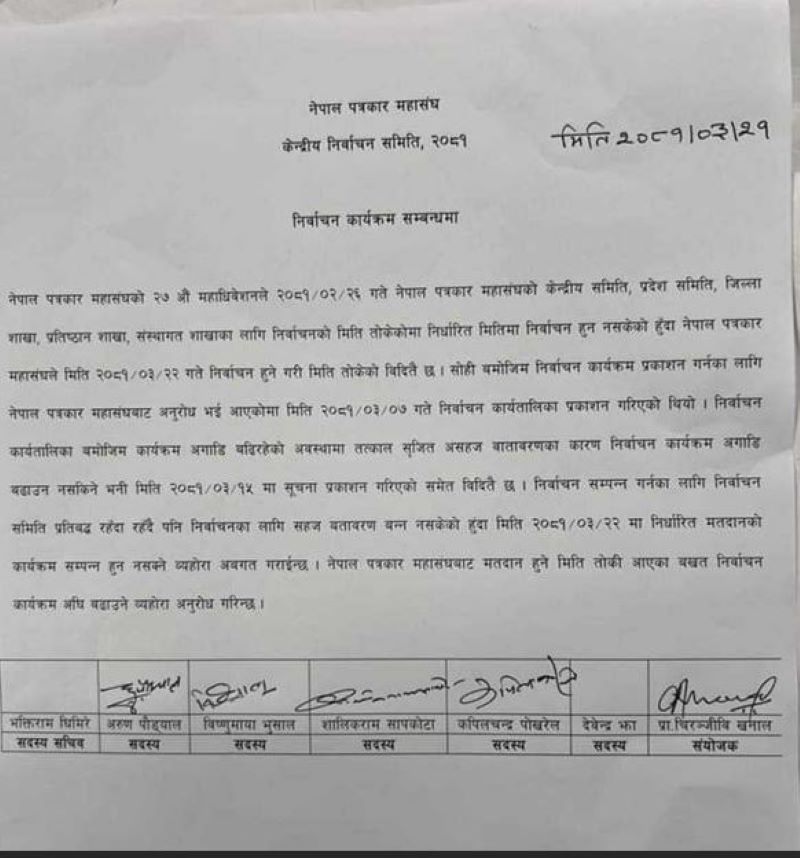काठमाडौं । नेपाल पत्रकार महासंघको निर्वाचन अन्तिम समयमा आएर पुनः स्थगित भएको छ ।शुक्रबार महासंघको केन्द्रीय निर्वाचन समितिले विज्ञप्ति जारी गर्दै यही शनिबारका लागि तोकेको निर्वाचन स्थगित भएको जानकारी गराएको हो ।