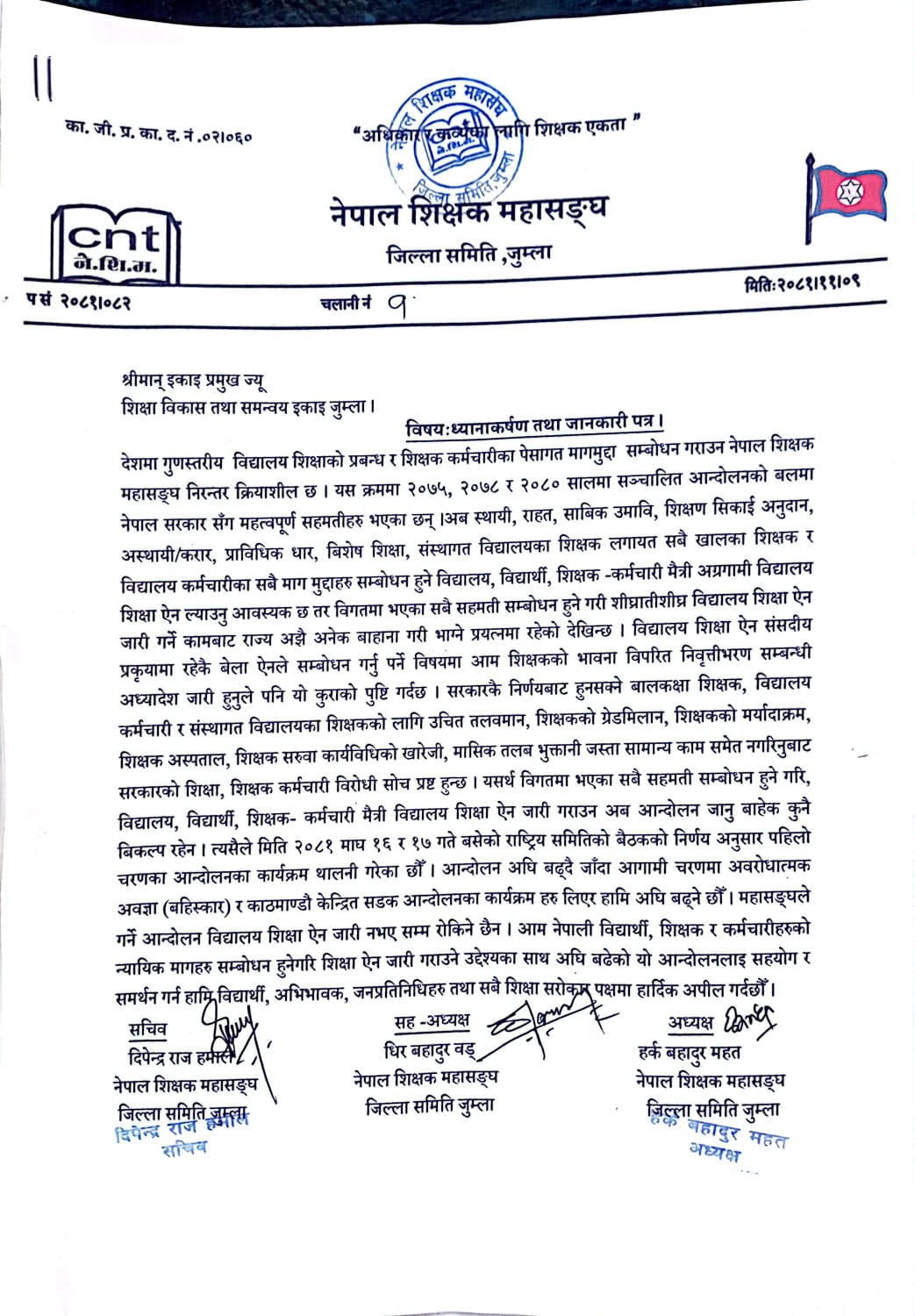 नेपाल शिक्षक महासंघ जिल्ला समिति जुम्लाले शिक्षा विकास तथा समन्वय इकाइ जुम्लाको ध्यानाकर्षण गराएको छ। निमित्त कार्यालय प्रमुख चेतराज पन्तलाई ध्यानाकर्षण पत्र बुझाएको हो । विगतमा सरकारले महासंघसँग गरेका विभिन्न सम्झौताहरू कार्यान्वयनको माग राख्दै शुक्रबार ध्यानाकषर्णपत्र बुझाएको छ । अहिलेसम्म उक्त सहमति कार्यान्वयन नभएको भन्दै महासंघ आन्दोलनमा उत्रिएको छ।