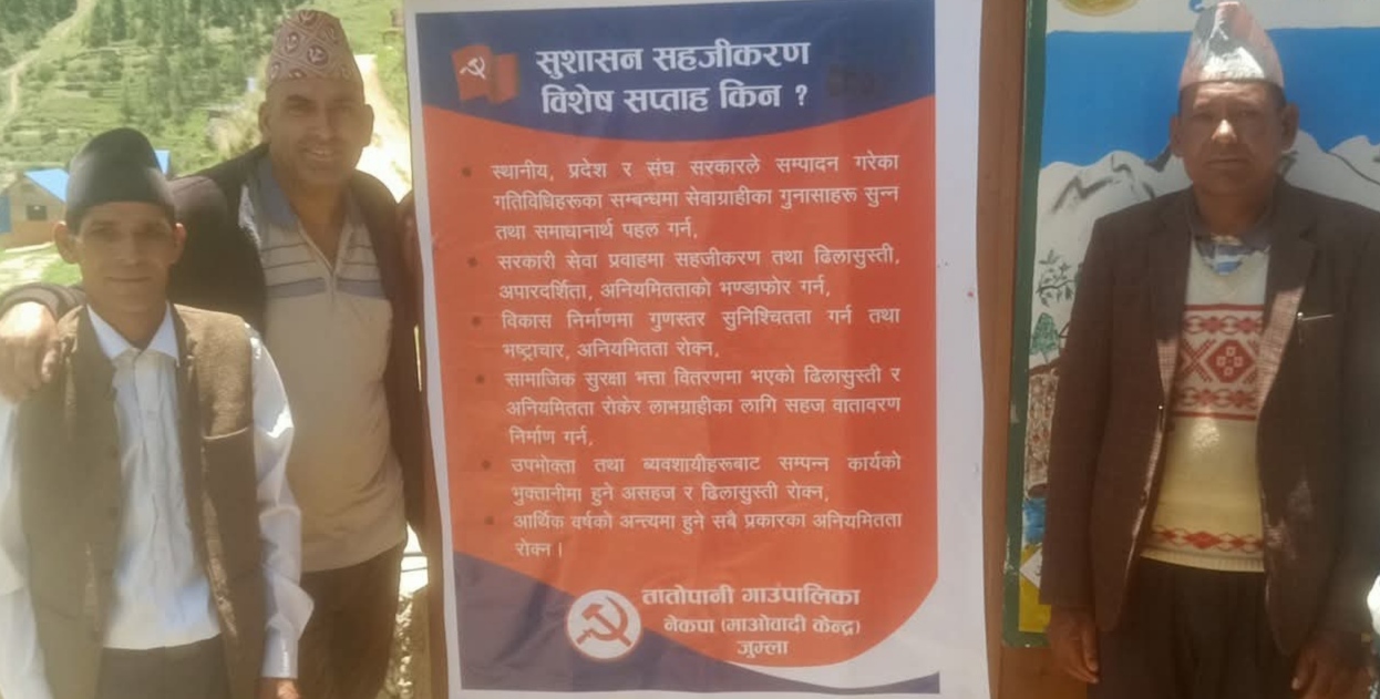 नेकपा माओवादी केन्द्र जुम्लाले सन्चालन गरेको सुशासन सहजीकरण विशेष सप्ताह आज सम्पन्न भएको छ। जुम्लाका सरकारी कार्यालय र ८ वटै स्थानीय तह चन्दननाथ नगरपालिका , तातोपानी , तिला,हिमा,सिन्जा, कनकासुन्दरी , पातारासी र गुठिचौरमा सन्चालन गरिएको उक्त सप्ताह सम्पन्न भएको हो।